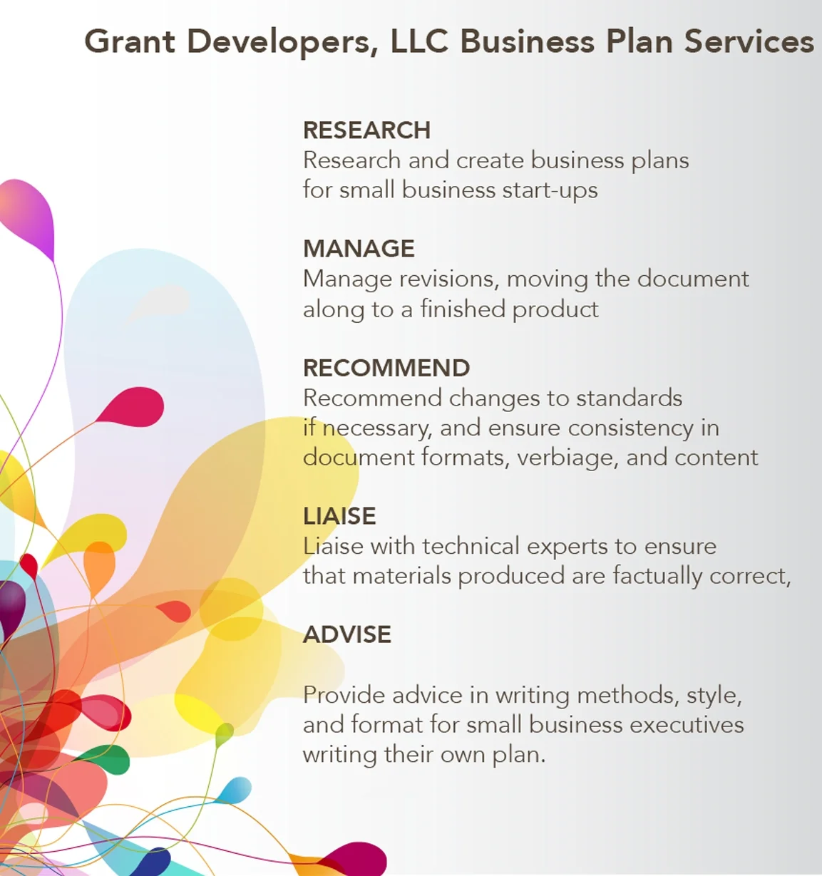 My primary goal is to be available to the SBA and the SBDC’s entrepreneurs who need specialized business plan writing, grant development or request for proposal response services. The Small Business Development Centers (SBDCs) is not a competitor, but a central point of contact for finding people who do not want to write a business plan. Not completing your plan, nor starting your business directly affects the federal statutory government-wide’s small businesses impact goal.